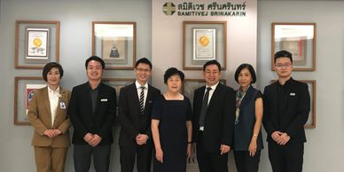 泰国三美泰医院学术交流。“云南试管婴儿第一人”章晓梅教授(居中),泰国泰生宝国际医疗集团陈达仁博士(左3),三美泰医院医生及助理院长(右3),就试管婴儿及辅助生殖技术进行了探讨和交流。